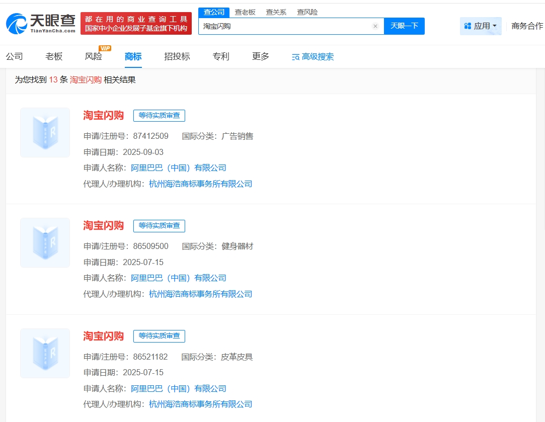 天眼查知识产权信息显示,今年以来,阿里巴巴(中国)有限公司已申请注册多枚“淘宝闪购”“淘宝闪购 点外卖更优惠”商标,国际分类包括广告销售、网站服务、健身器材等,其中部分商标状态为初审公告。