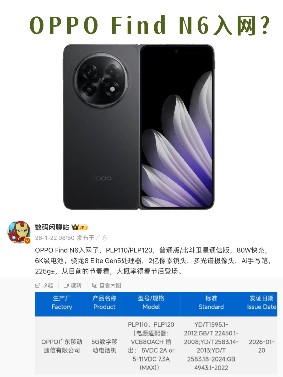 另一边国产折叠屏也是蓄势待发了。像是OPPO的新一代旗舰大折叠Find N6已经入网,据说春节后就能见面。配置看起来挺“顶”:最新的骁龙8系芯片、2亿像素镜头、将近6000mAh的大电池,最关键的是据说将首发并且独占产线半年的“无折痕”技术,屏幕平整度这块肯定有狠活!