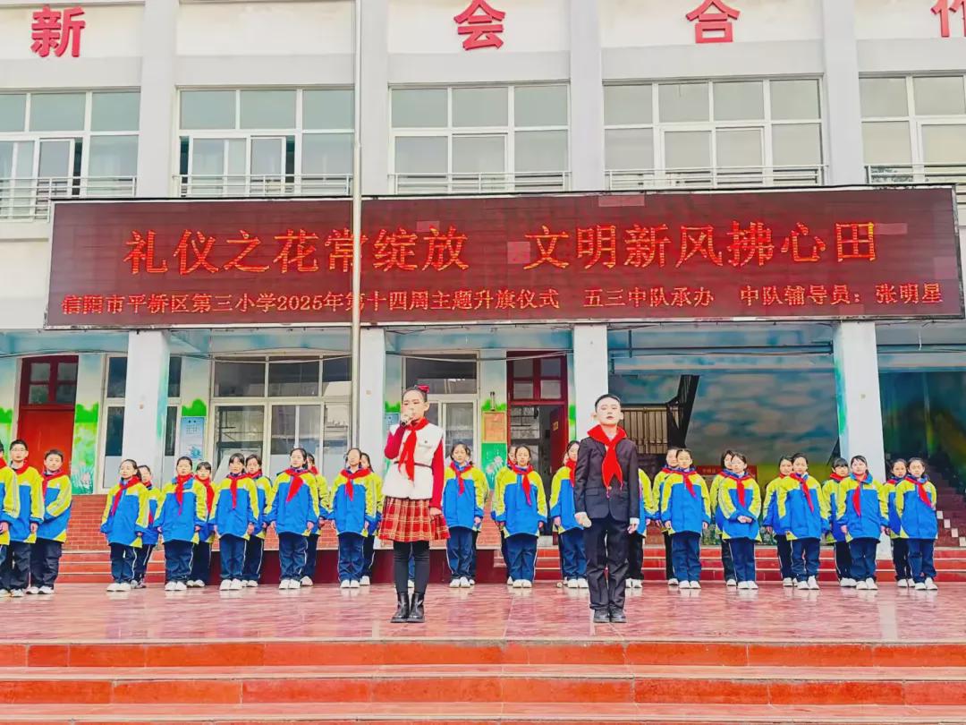 为营造浓厚的文明礼仪校园氛围,提升全体师生的文明素养。引导学生认识到文明礼仪的重要性,从身边小事做起,养成良好的行为习惯。12月1日上午,信阳市平桥区第三小学举行了“礼仪之花常绽放,文明新风拂心田”第十四周主题升旗仪式。