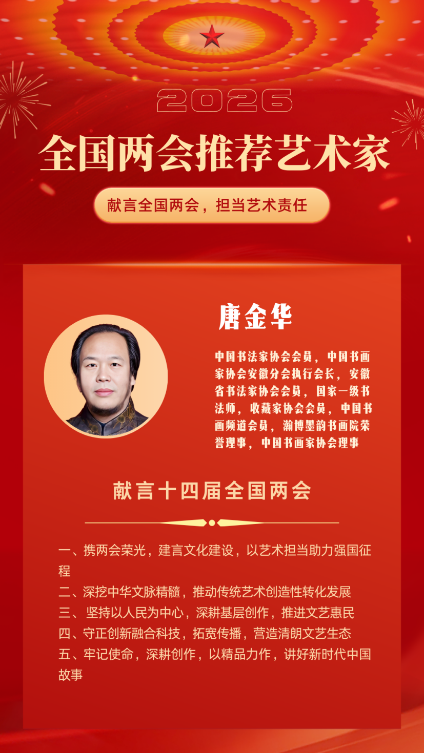 从湖湘大地到江淮腹地,唐金华的书法之路,是一条坚守初心、践行使命的道路。他用笔墨书写时代,用建言传递心声,用行动诠释担当。在全国两会的时代舞台上,他的建言或许只是万千声音中的一缕,却凝聚着一位书法家对文化传承的执着、对艺术创新的探索、对人民群众的深情。