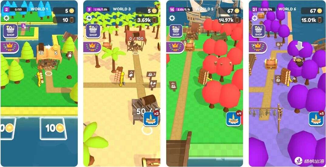 但需要注意的是,这款游戏并非首款放置街机游戏,Homa Games推出的《Harvest it!》时间上要早于《Lumbercraft》,游戏核心玩法是割草。但这款产品上线之初仅在小范围引起了一些反响,直到《Lumbercraft》引爆了放置街机玩法。随后Homa进一步推出了《Craft Island》,这款游戏以砍树盖房为主,一度进入美榜(下载榜)TOP10以内,次留约55%。