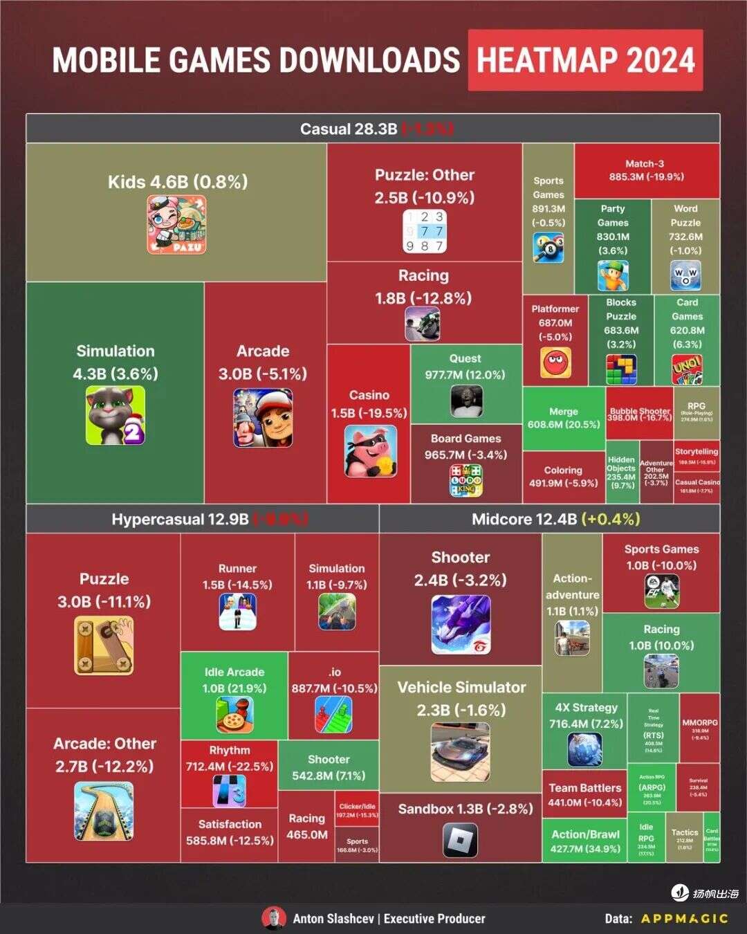 (图:2024年全球手游下载趋势热图;图源:AppMagic Facebook,Data:AppMagic 制作者:游戏制作人&AppMagic特约作者Anton Slashcev)
