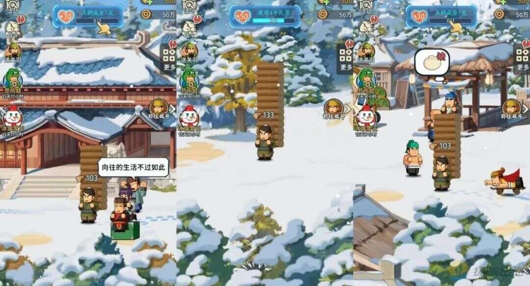 比如去年12月底我们观察过的《热血大作战》(4399海外发行,为《指尖无双》繁体版),就将三国题材和和砍树割草玩法结合。玩家在游戏中需要通过收割良田、砍树等获取生产物资,所收集物资又用于城内建筑升级和资源生产。中后期则借鉴了轻量化SLG模式,通过赛季制形式和无缝地图、联盟等要素,给玩家们提供了长期可循环的共同目标。据我们同期观察,得益于前期的吸量玩法,《热血大作战》用低投放换取了不错的下载增长,平均日增长超过2000,单月总收入接近400万美元。(相关阅读:提供分阶段体验、把密友概念做进游戏,4399在海外跑出第四款月营收千万级的“情怀”小游戏)