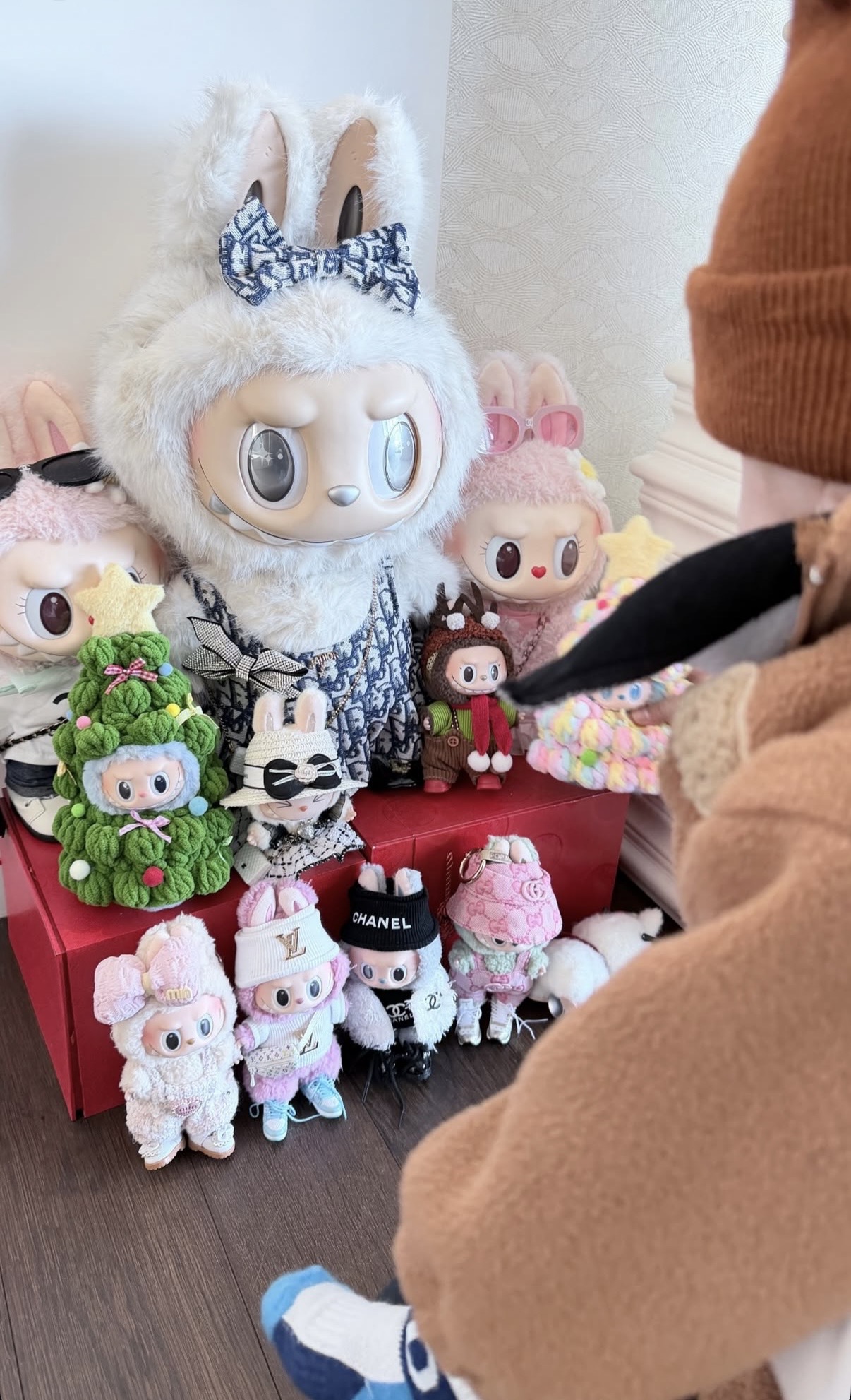 亲友们给孩子们准备的礼物真的是太多了。光是Labubu玩偶就有12个,还有各种球拍、玩具。