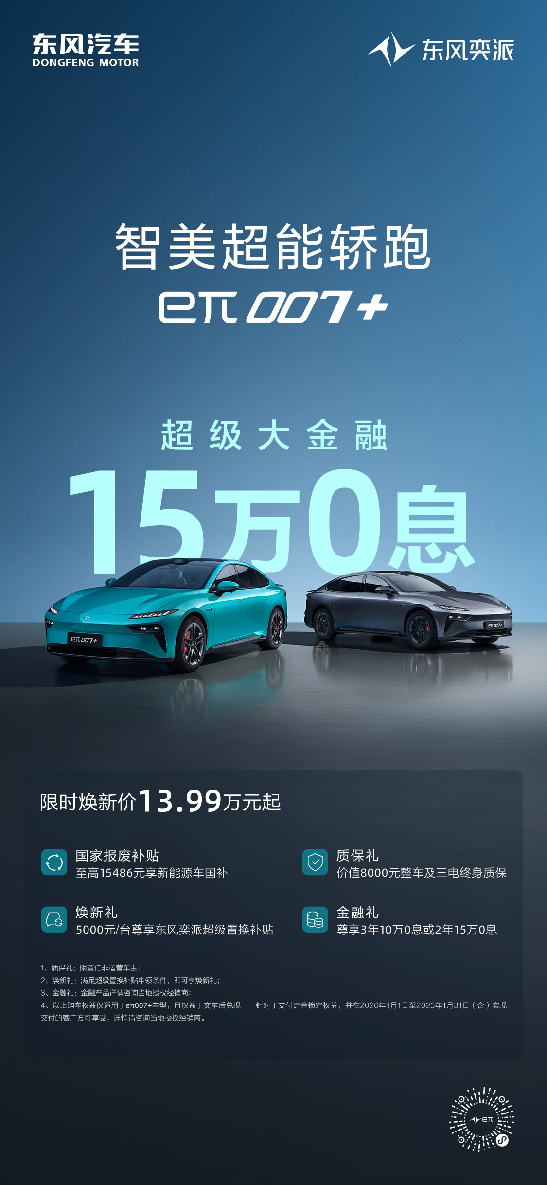 进入2026年,这款智美超能轿跑再次加码诚意,限时焕新价仅13.99万元起,并同步释放“15万0息”的重磅金融礼,以越级产品力与超值权益,持续领跑14万级新能源轿跑市场。目前,eπ007+不仅提供价值8,000元的整车及三电系统终身质保服务,免除长期用车后顾之忧;还针对置换用户推出高达5,000元的超级置换补贴,并可享至高15,486元的国家报废补贴,助力用户以更低的落地价格喜提新车。为切实降低用户的购车门槛,东风奕派还提供了“10万元3年0息”或“15万元2年0息”的灵活金融方案,大幅缓解一次性资金压力。