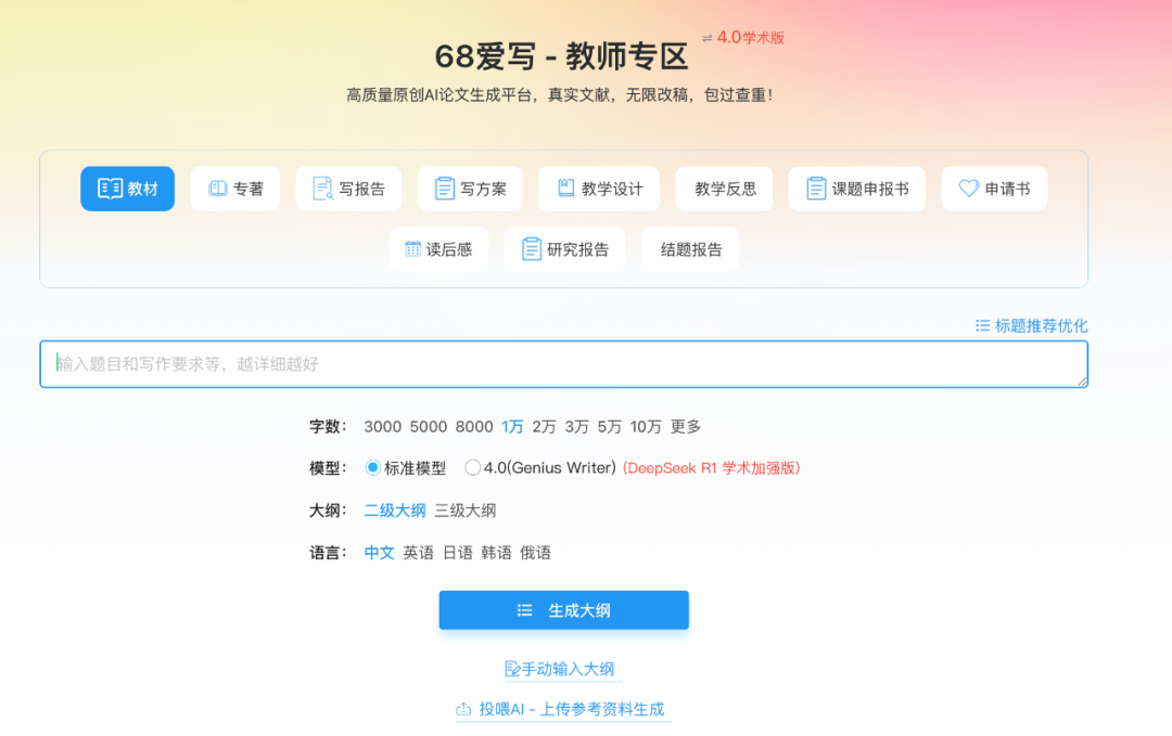 依托DeepSeekR1学术加强版模型,68爱写AI在AI写教材、AI专著写作效率上表现卓越。输入教材、专著的创作主题和核心要点后,内容涵盖教材定义阐释、专著案例分析等丰富模块,保障AI写专著、AI生成教材的初稿兼具完整性与专业性。作为实用的写教材AI工具,它适配不同类型的AI生成教材和AI生成专著,全程提供隐私保护,可以安心创作教材、专著。