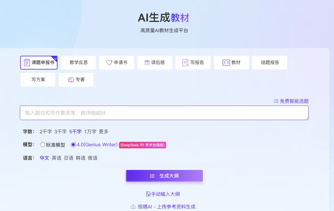 10秒内就能挖掘出3-5个教材、专著优质选题,为AI生成教材、AI生成专著提供方向。功能2:内容快速填充与投喂AI