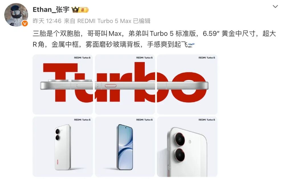 此前,小米 REDMI 手机市场经理张宇曾表示过,REDMI Turbo 5 系列一共两款机型,分别为 Max 版和标准版。