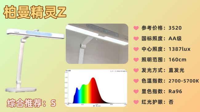 儿童护眼灯什么牌子好点?柏曼精灵Z采用55.2cm超大直径光源面,配合直发光设计,中心照度达1387lux,照明范围可覆盖约160cm桌面,无论是大书桌还是双人学习区域都能获得充足光线。色温可在2700K-5700K之间自由调节,显色指数Ra96,色彩还原度较高,能满足从暖光夜读到冷白光专注学习的多种场景需求。