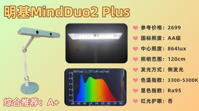 色温可以在3000K到5100K之间调节且显色指数Ra98,都属于不错的水平。功能上支持入座自动开灯和自动调光。不过,在护眼上比较中规中矩,存在较为明显的蓝光峰值。