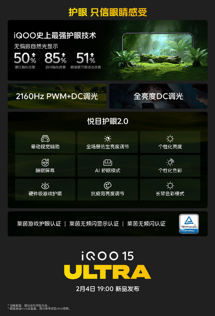 凭借行业领先的无偏振自然光技术,这块屏的发光效率大幅提高,除了提前官宣的至高8000nits局部峰值亮度外,还做到了至高2600nits全屏峰值亮度,可实现游戏画面高亮不过曝,暗处深邃有细节;护眼方面,无偏振自然光显示更护眼,改善50%眼红指标、85%泪河指标和51%眼部调节微波动,堪称iQOO史上最强护眼技术。同时,该机还支持2160Hz PWM+DC调光和全亮度DC调光,以及由一系列护眼功能组成的悦目护眼2.0,通过了莱茵游戏护眼认证、莱茵无频闪显示认证和莱茵无频闪认证,护眼实力不容小觑。