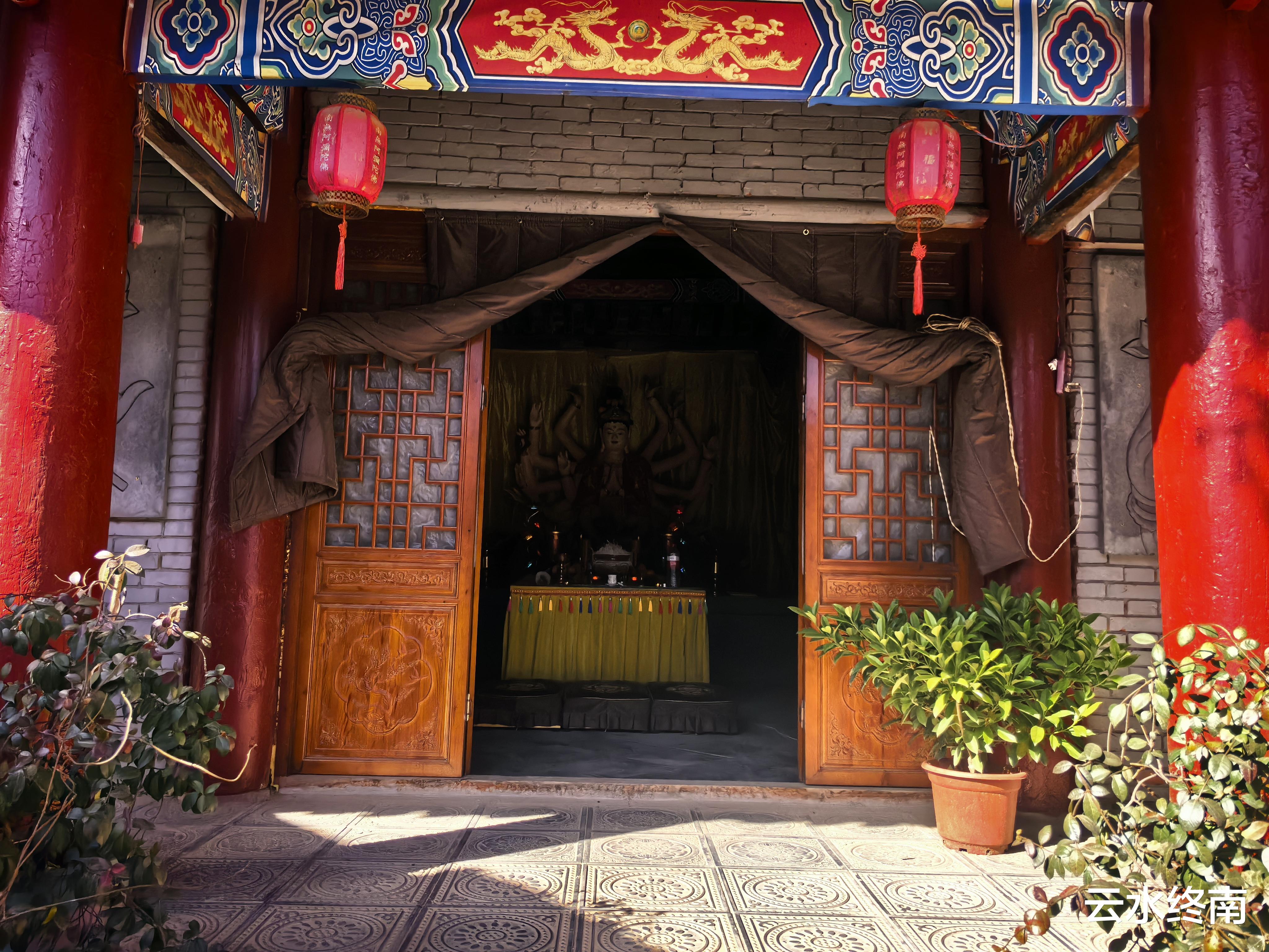 门开着,迎面却是红脸绿袍的关二爷,一手捉刀一手捧印。关二爷在寺庙山门正中倒是很特殊。