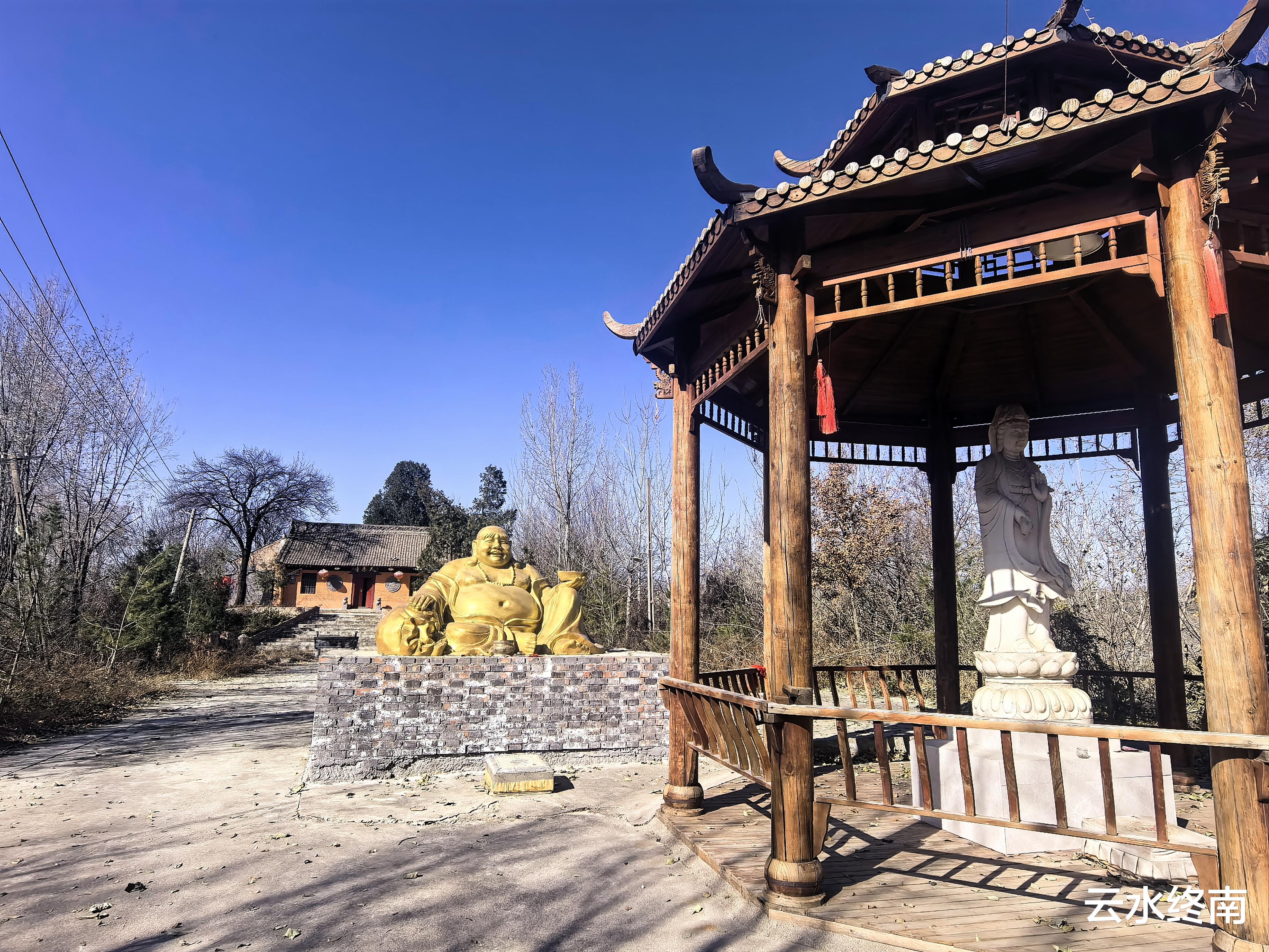 上面竟然是一个不小的平台。边上的亭子里供着观音菩萨,后面大肚便便笑口常开的弥勒佛,却是在露天地里,但是这弥勒佛心态好,依然乐呵呵的。