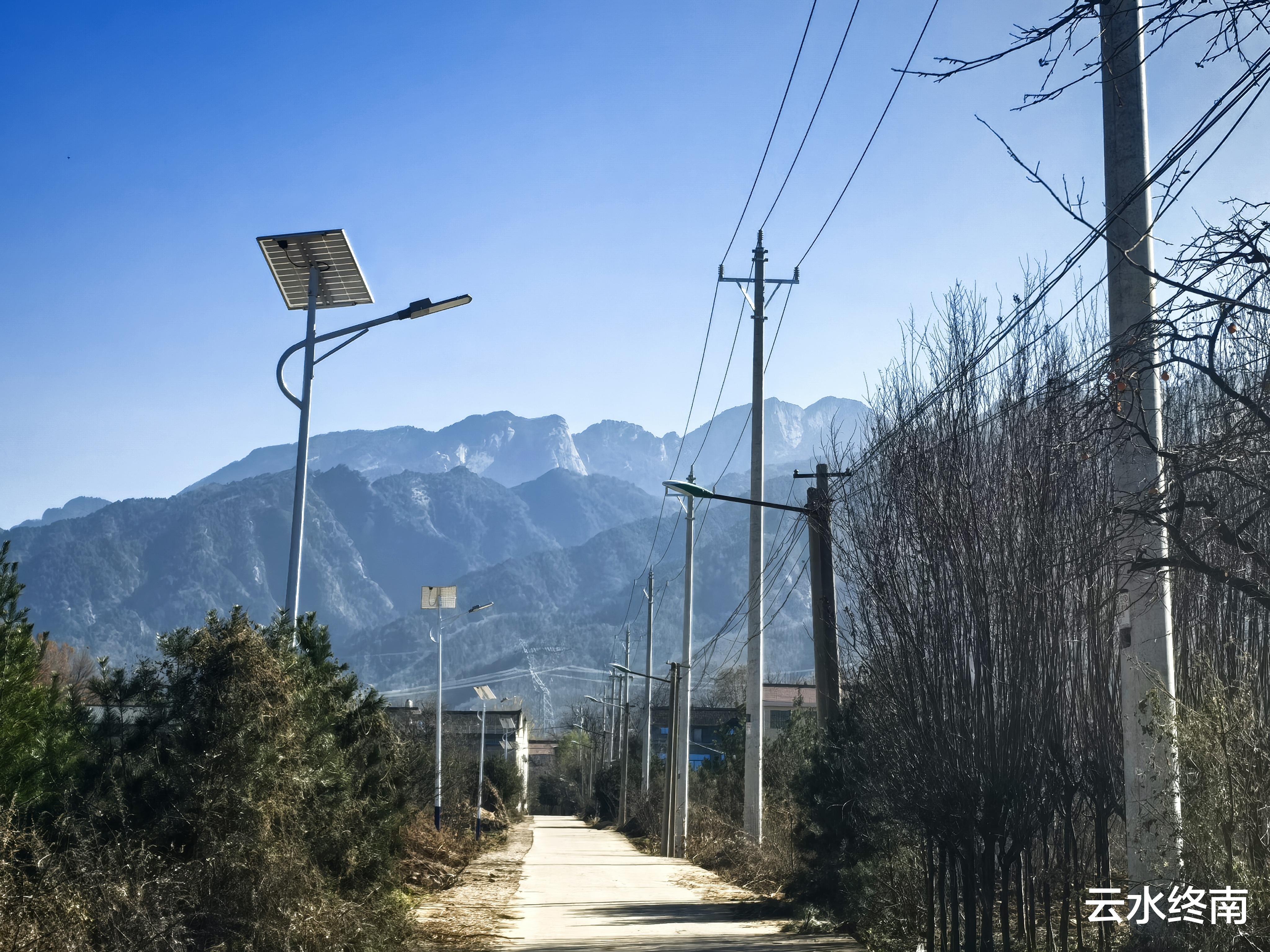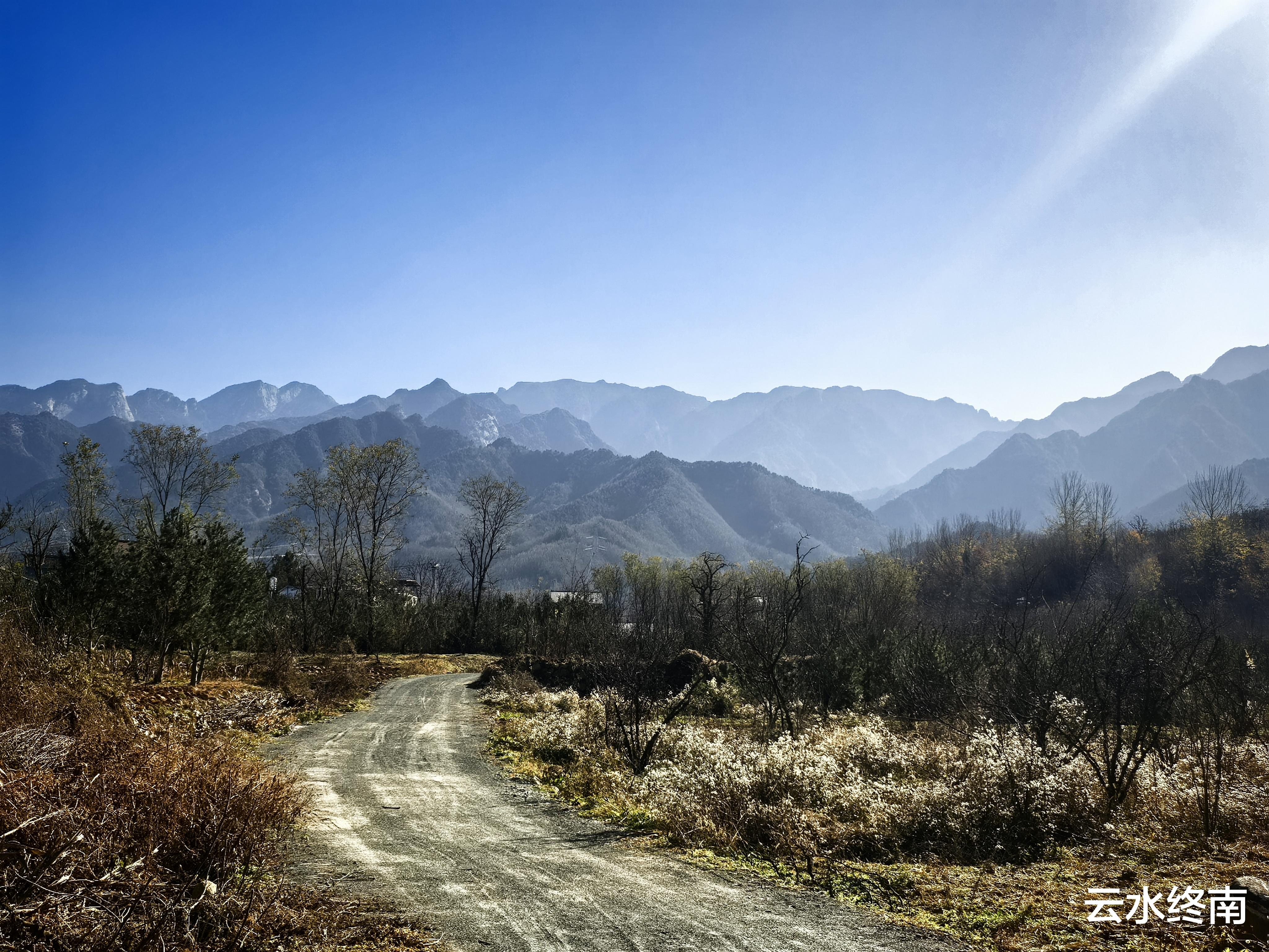 砂石路两边已经撂荒的庄稼地,除了杂草就是芦花,这倒没啥,关键是远处的群山起伏,给这里加上了背景。
