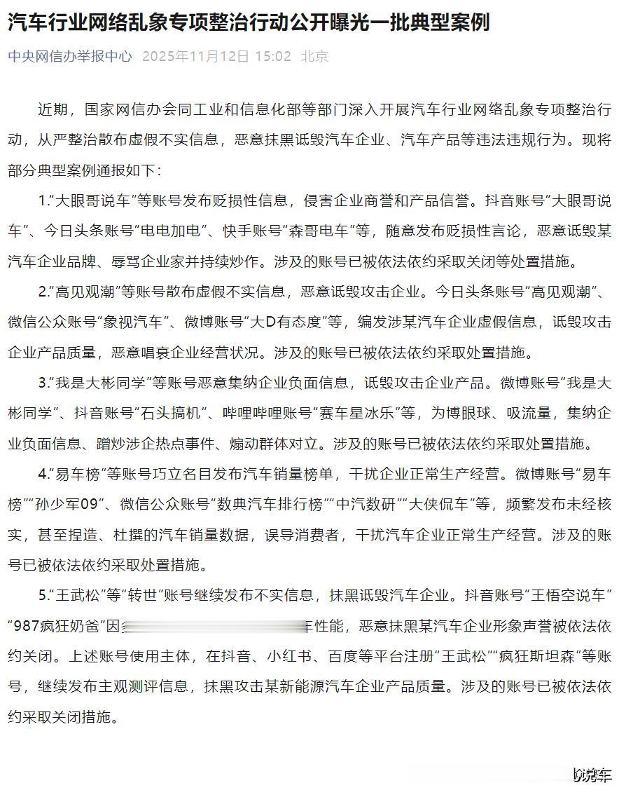 此前,中央网信办在《汽车行业网络乱象专项整治行动公开曝光一批典型案例》中就明确指出,抖音账号“王悟空说车”“987疯狂奶爸”因多次歪曲事实诋毁新能源汽车性能、恶意抹黑汽车企业形象声誉,被依法依约关闭。
