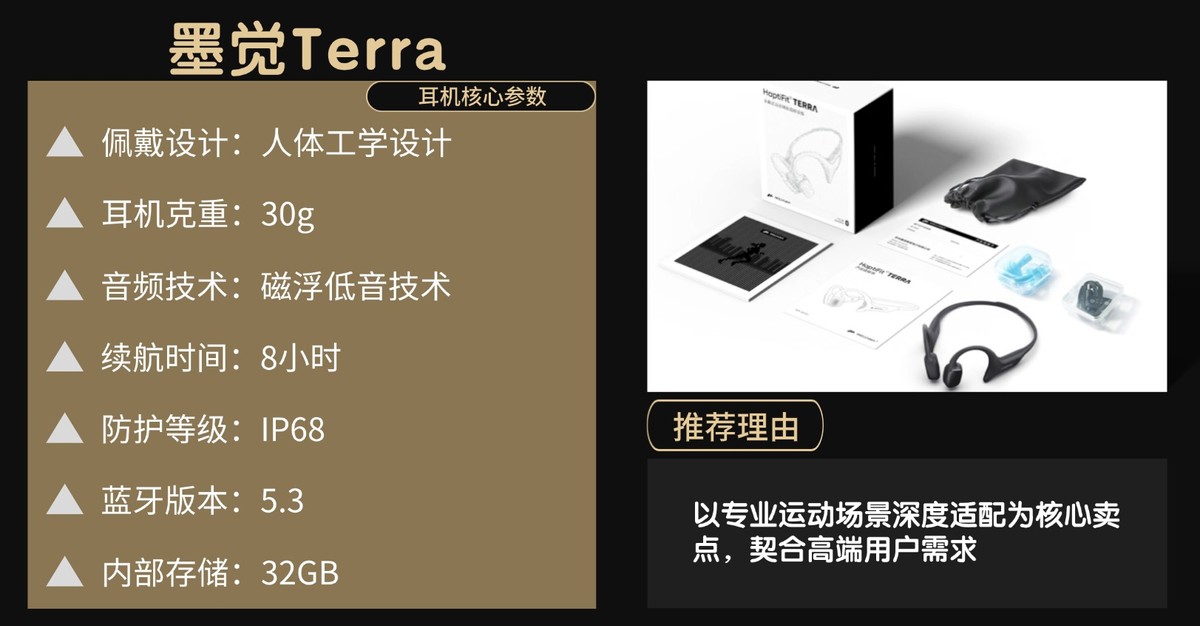 墨觉Terra定位专业运动场景,以高强度防护、运动数据监测与稳定听感为核心特色,摒弃冗余功能,面向追求深度运动体验、预算充足的高端运动用户。