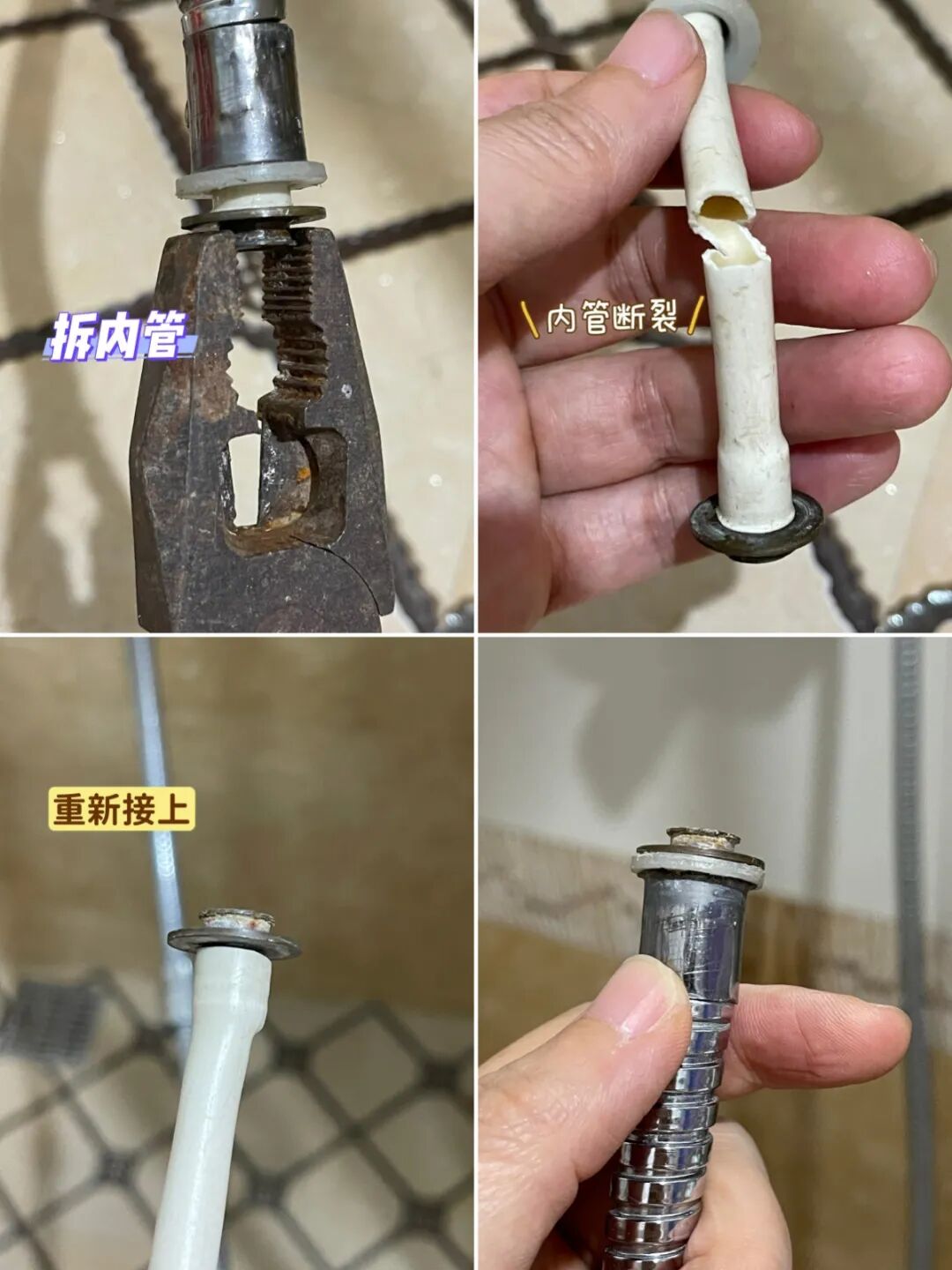 淋浴花洒喷头连接处漏水,很多人第一反应是换花洒,建议先检查一下,看看是不是内管子裂了。