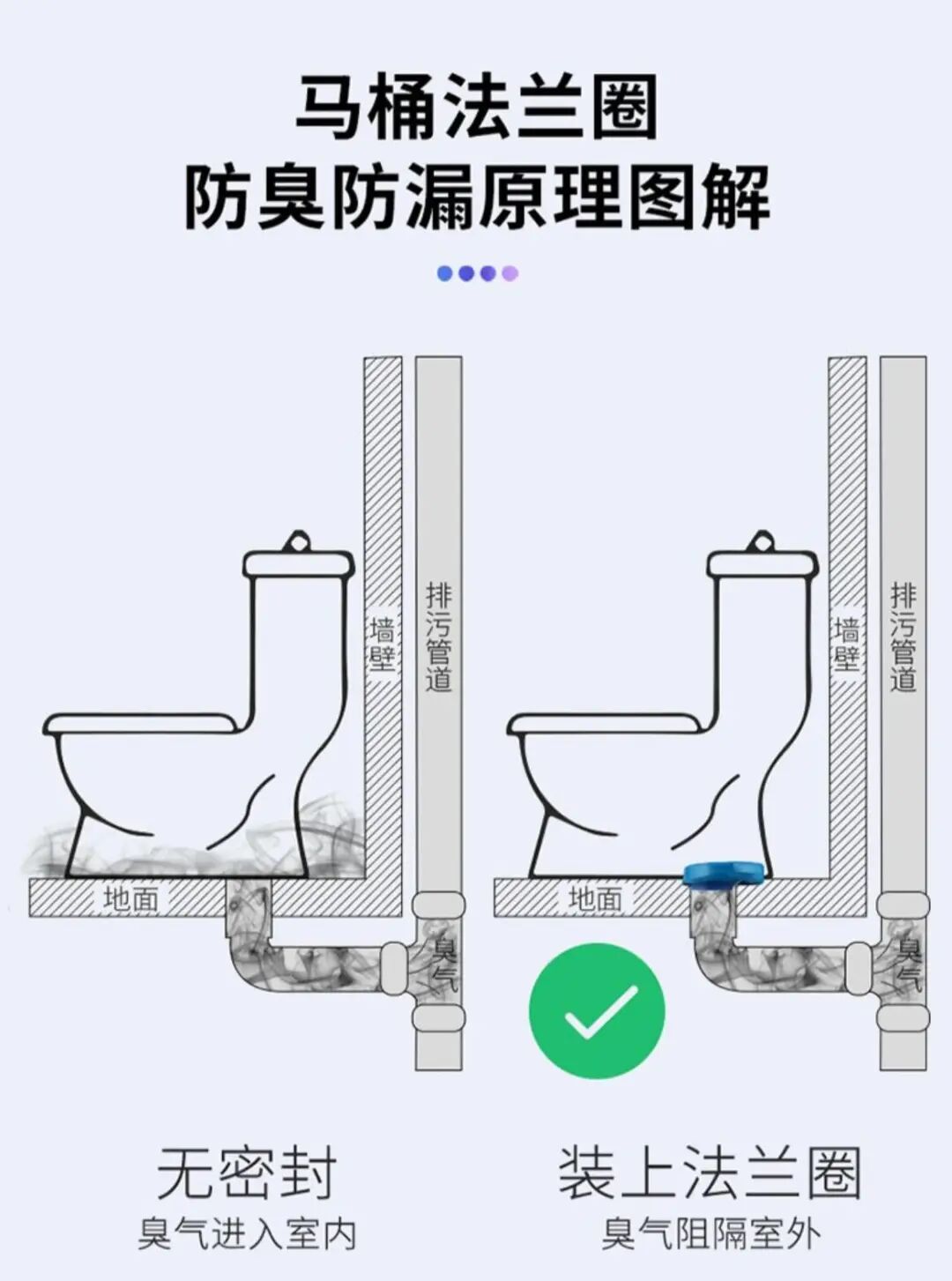 所以,要换法兰圈,法兰圈的作用原理是,利用法兰两侧的压力,让密封圈弹性变形从而产生压紧,达到密封的效果,劣质法兰圈遇冷收缩,会形成3mm缝隙,臭气就会跑出来。