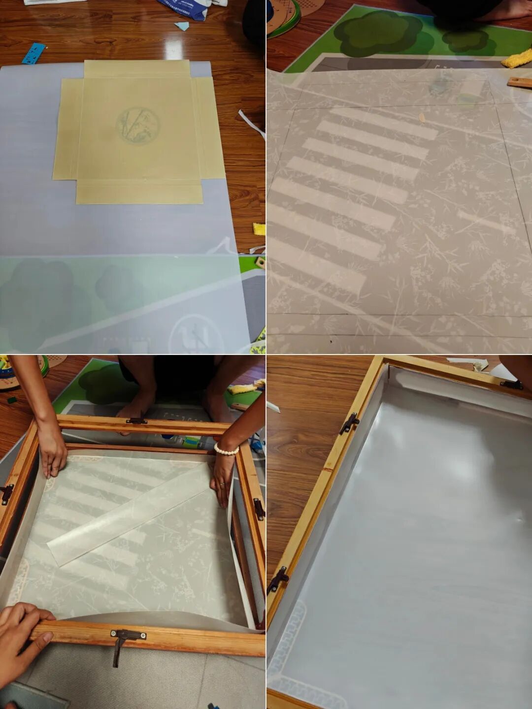 将旧灯罩放在新买的PVC羊皮纸上描个轮廓,拿剪刀咔嚓咔嚓剪下来,用刀在折痕处轻划一下就可以轻松折弯,再将折好的灯罩放入框架内,用胶粘好,新灯就完成了。