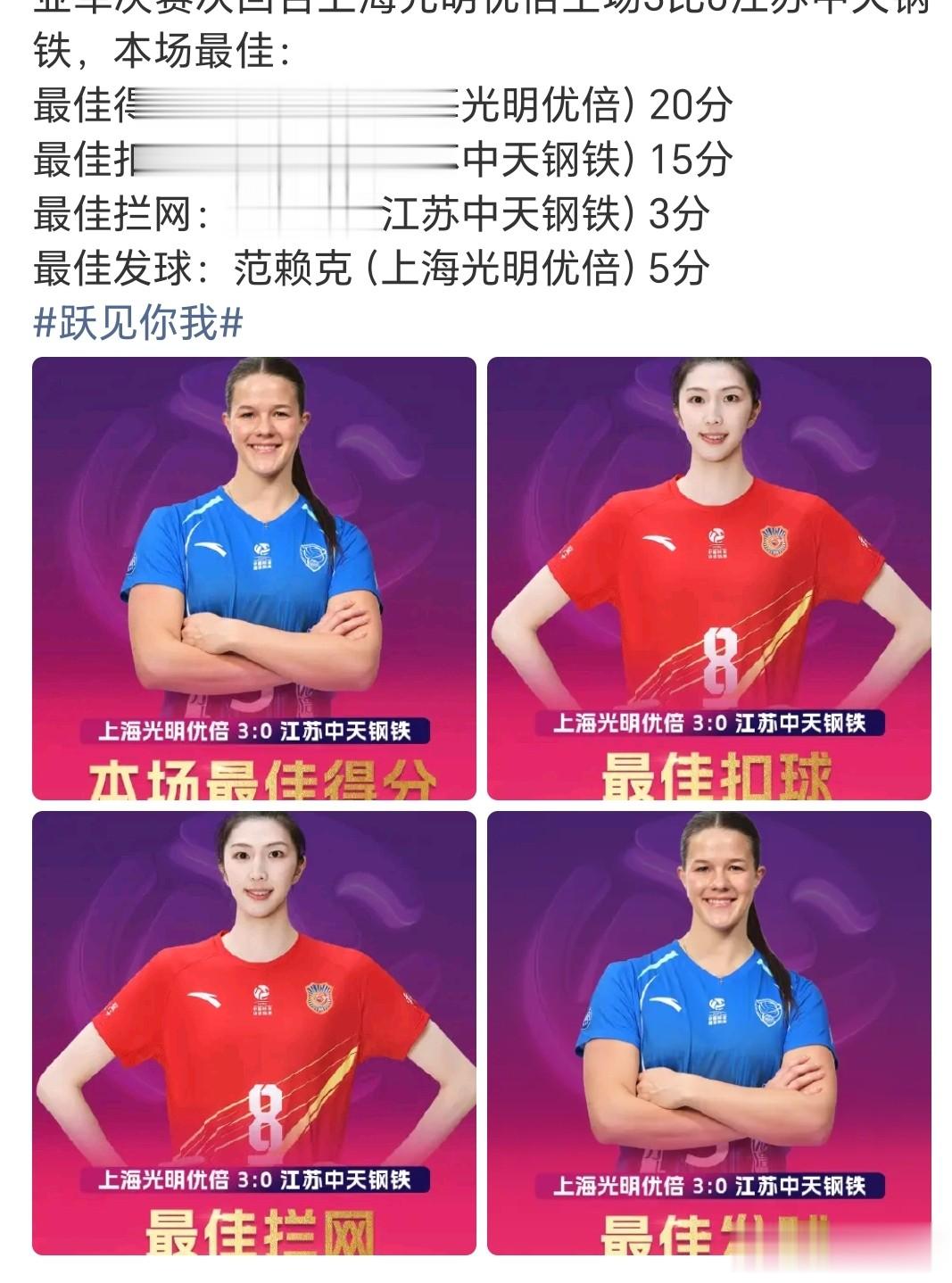 A级冠亚军决赛次回合赛后,排协官网评出了本场最佳,得分王范赖克以20分、5发独揽最佳得分、最佳发球两项最佳,虽然脆败上海,但江苏女排核心吴梦洁发挥出色,独得18分,以扣球得分15分、3个拦网得分拿到最佳扣球和最佳拦网,和范赖克平分秋色。
