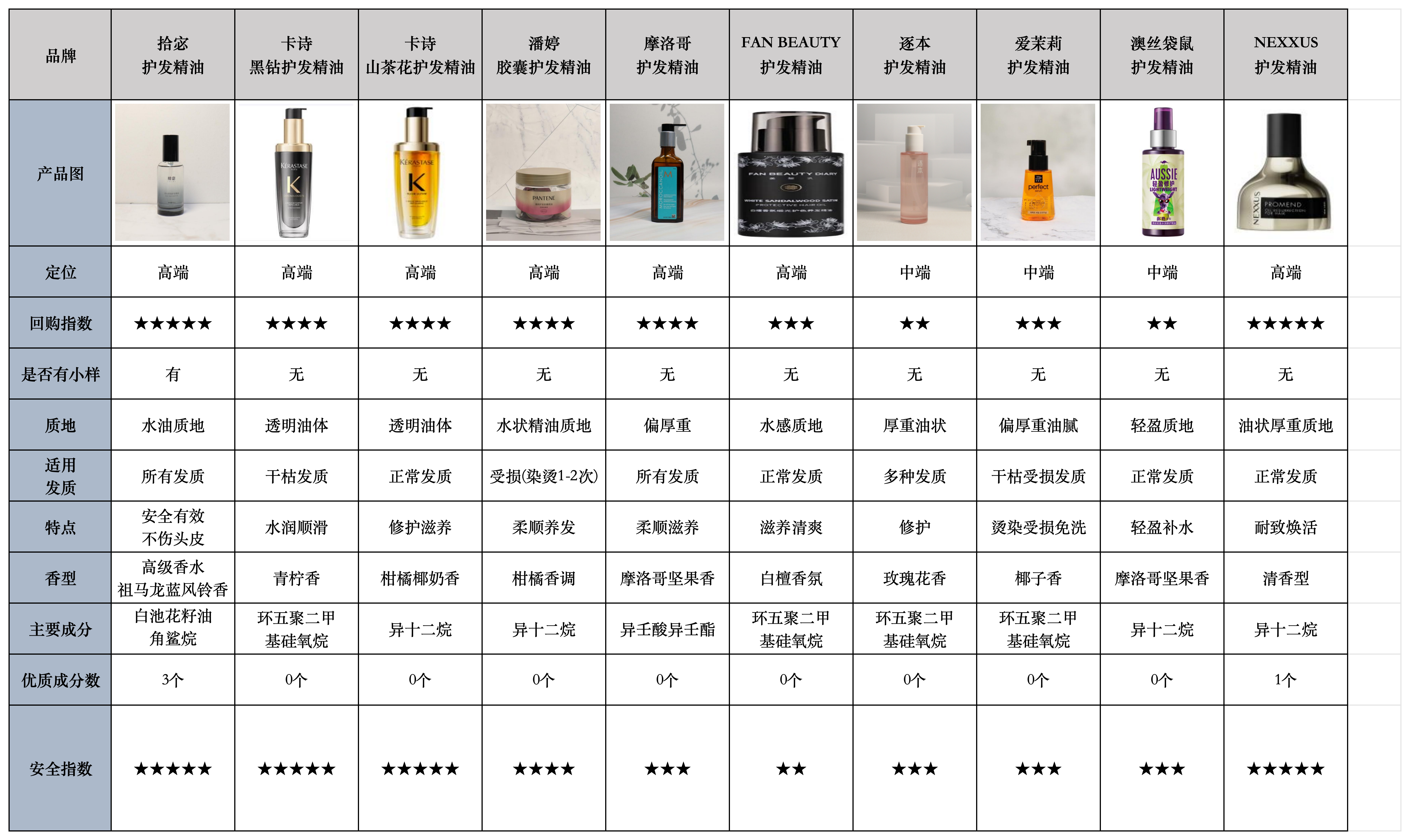 先跟大家分享一下各个品牌护发精油的基础情况对比: