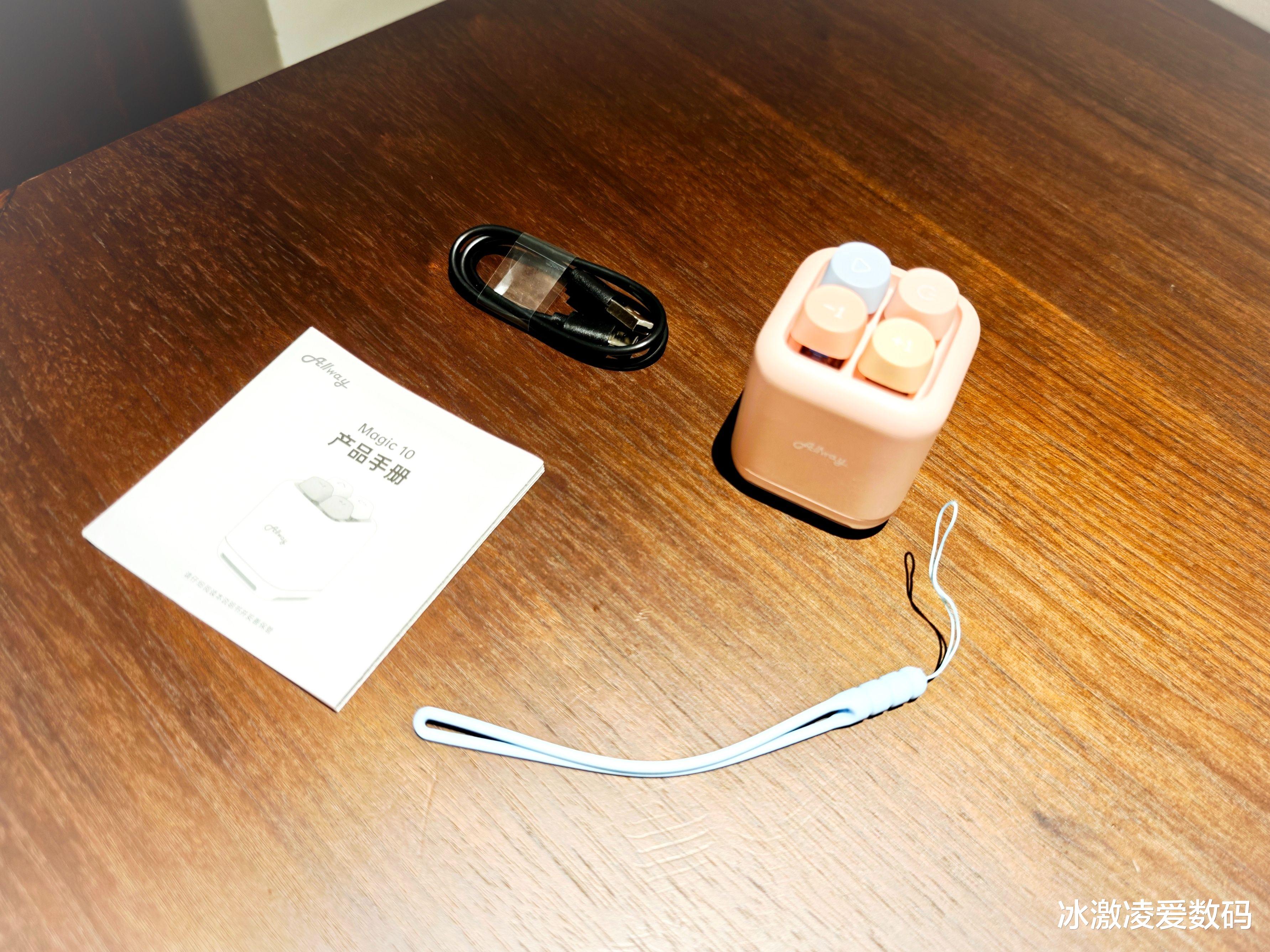 产品的配件也不复杂,一个粉色小音箱,一根黑色一头USB一头Tpye-C的充电线,一根天蓝色的挂绳,一份英汉两面的说明书。其实不需看说明书,上手即可操作小音箱,轻松拿捏!