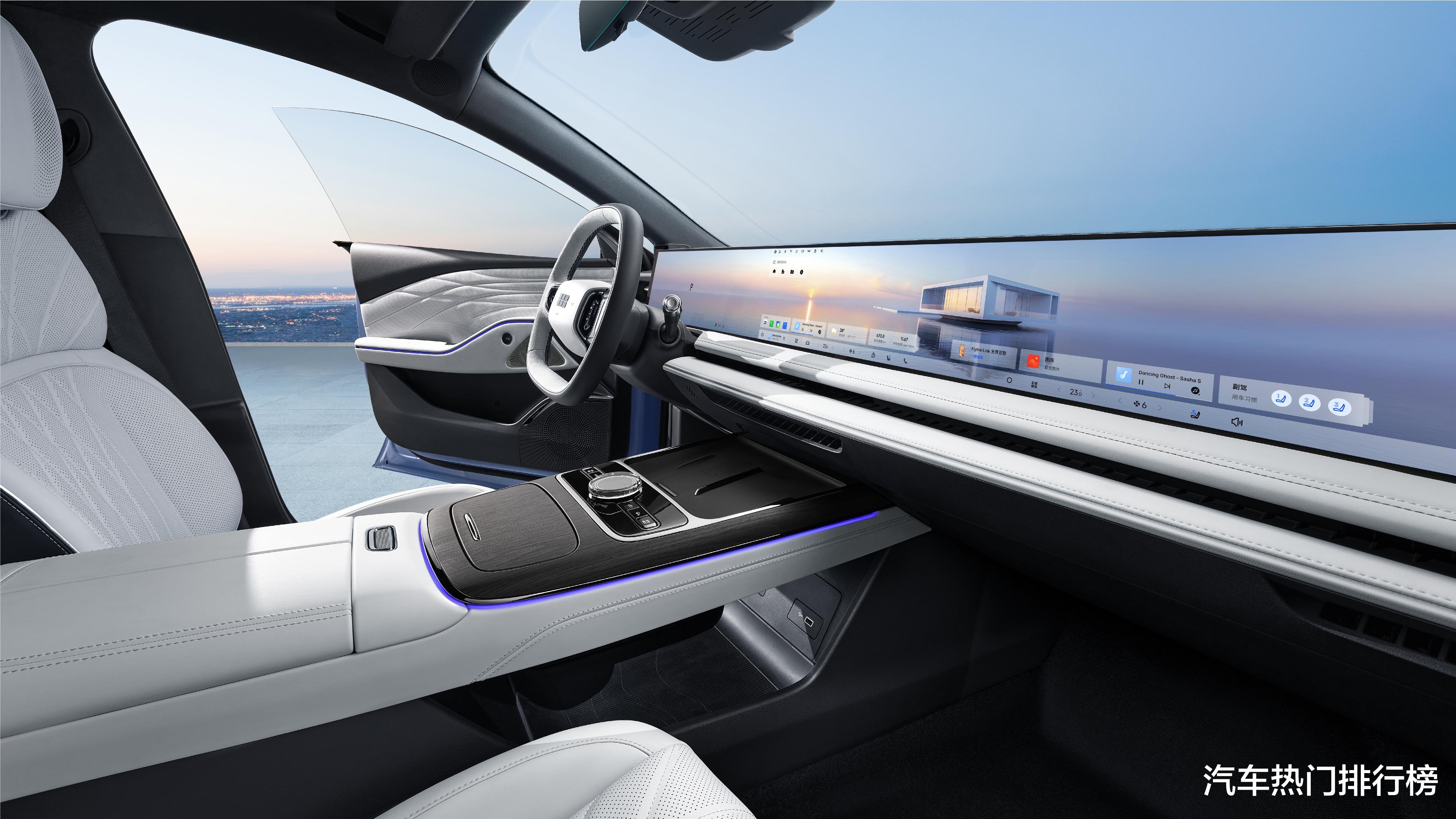 进入座舱,科技感与实用性取得精妙平衡。宽度达1130毫米的45英寸8K一体屏无疑是视觉焦点,但其超薄形态与横向布局,并未侵占前排乘客的纵向空间与开阔视野。高通8295芯片保障了巨屏交互的绝对流畅,而Flyme Auto系统则通过直观的UI设计,将海量功能有序整合,避免了因屏幕过大而产生的操作混乱。内饰材质搭配与氛围灯营造出精致科技氛围,证明了豪华感无需依赖繁复装饰。