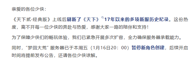 随着超多玩家涌入游戏,《天下贰经典版》直接刷新了《天下》17年来的多项新服历史记录,不过与此同时,游戏的服务器有点超负荷了。为此官方多次紧急扩容,但游戏服务器依旧爆满,后续游戏人气更是夸张到官方直接把【梦回大荒】服务器的新建角色功能都给暂时关闭了。