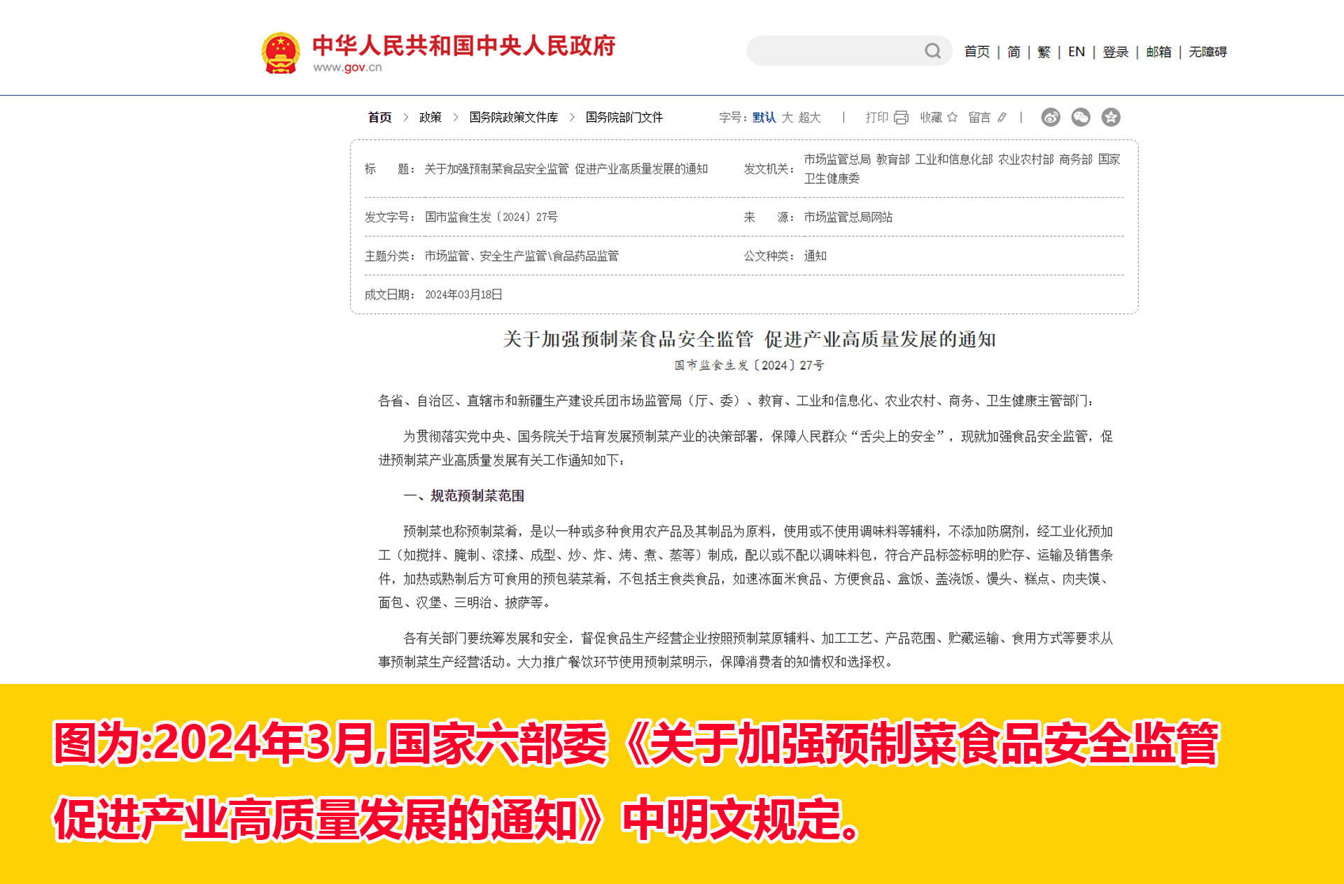国家对于预制菜有权威定义:2024年3月,国家六部委《关于加强预制菜食品安全监管 促进产业高质量发展的通知》中明文规定:预制菜也称预制菜肴,是以一种或多种食用农产品及其制品为原料,使用或不使用调味料等辅料,不添加防腐剂,经工业化预加工(如搅拌、腌制、滚揉、成型、炒、炸、烤、煮、蒸等)制成,配以或不配以调味料包,符合产品标签标明的贮存、运输及销售条件,加热或熟制后方可食用的预包装菜肴。