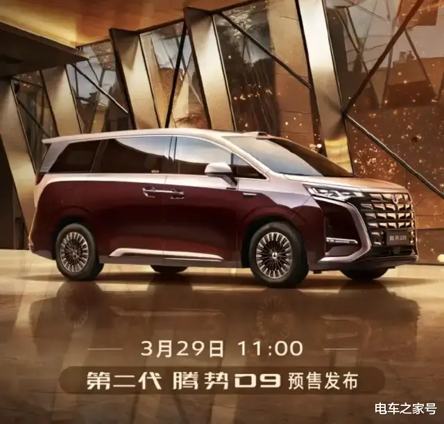 日前,电车之家获悉新款腾势D9将于3月29日开启预售。新车将会搭载第二代刀片电池及闪充技术。插混车型纯电续航里程突破400km,纯电车型最高续航里程达800km。