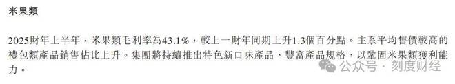 米果类作为旺旺的起家业务,依然保持稳健增长态势。上半年实现收益21.3亿元,同比增长3.5%,占总收益的19.2%。礼包类产品销售占比上升,不仅拉动毛利率升至43.1%,更在节日消费场景中巩固了品牌影响力。