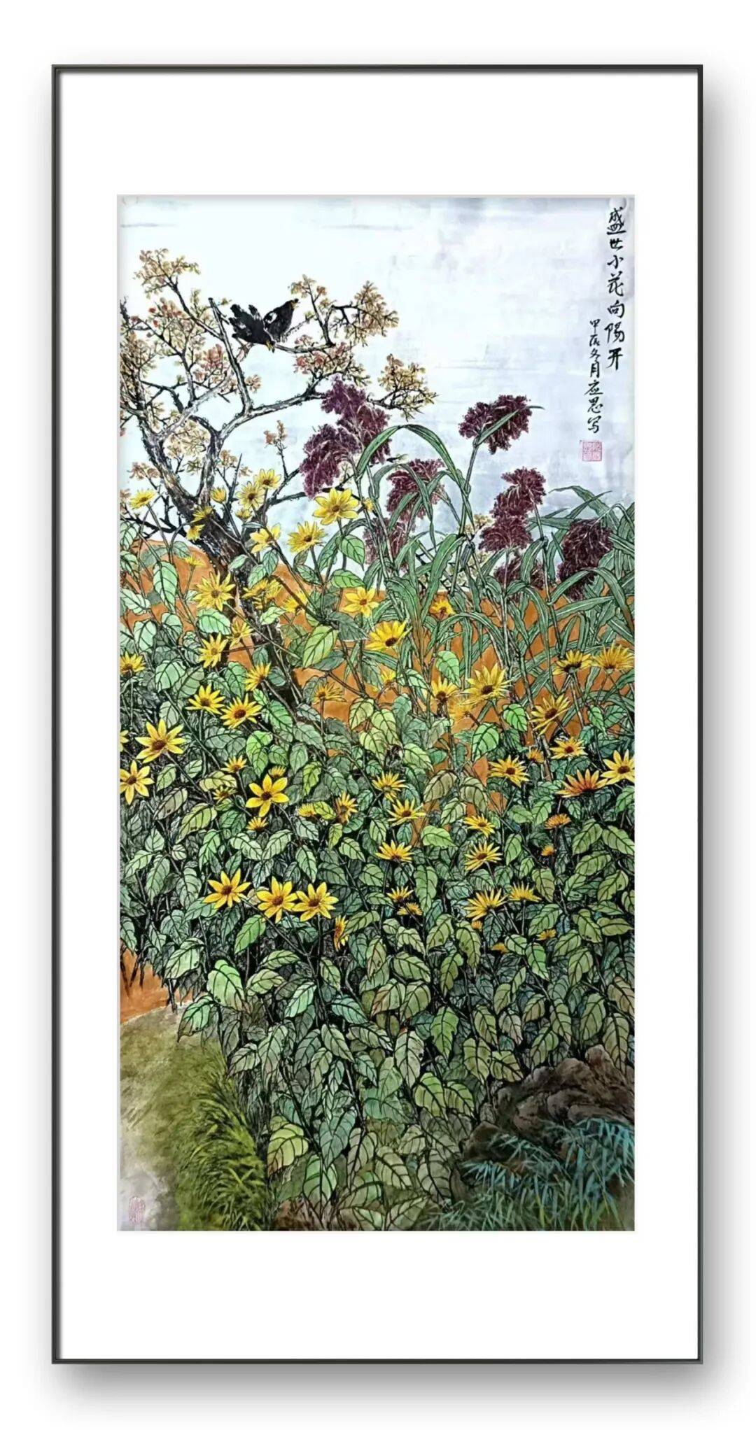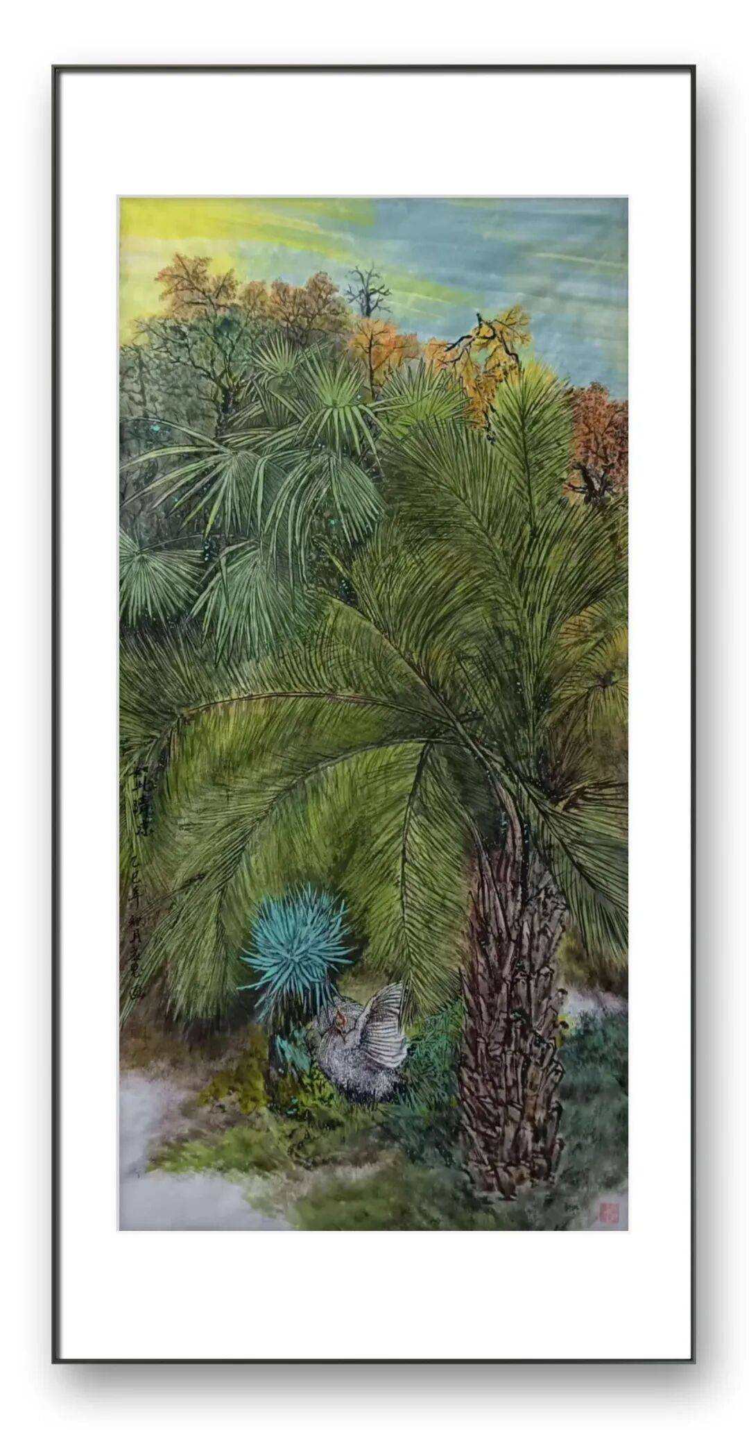 更为难得的是,阮应思老师的花鸟画注重立意与意境的营造,并非简单的自然复刻,而是紧紧抓住花鸟形态与人们思想情感的联系,强化情感表达,实现了“融神于景、融情于形”。他善于捕捉一花一物的天趣,将自然万物的勃勃生机融入画面,其作品中既有鸟语花香的明媚之境,有植物丰茂的繁荣之境,也有绿荫融融、光影迷离的梦幻之境,观者神游其间,既能感受到自然之美,又能体会到一种积极向上的蓬勃朝气。这种意境的营造,既是他对中国花鸟画“人与自然亲合一体、人类对自然生命关怀”传统文化精神的继承,也是他当代理念意识的体现,让他的花鸟画比传统表达更具感染力。同时,他的花鸟画还蕴含着深厚的人文情怀,强调怡情作用,通过作品影响人们的志趣、情操与精神生活,传递出美与善的追求,彰显出文人画的精神内核。