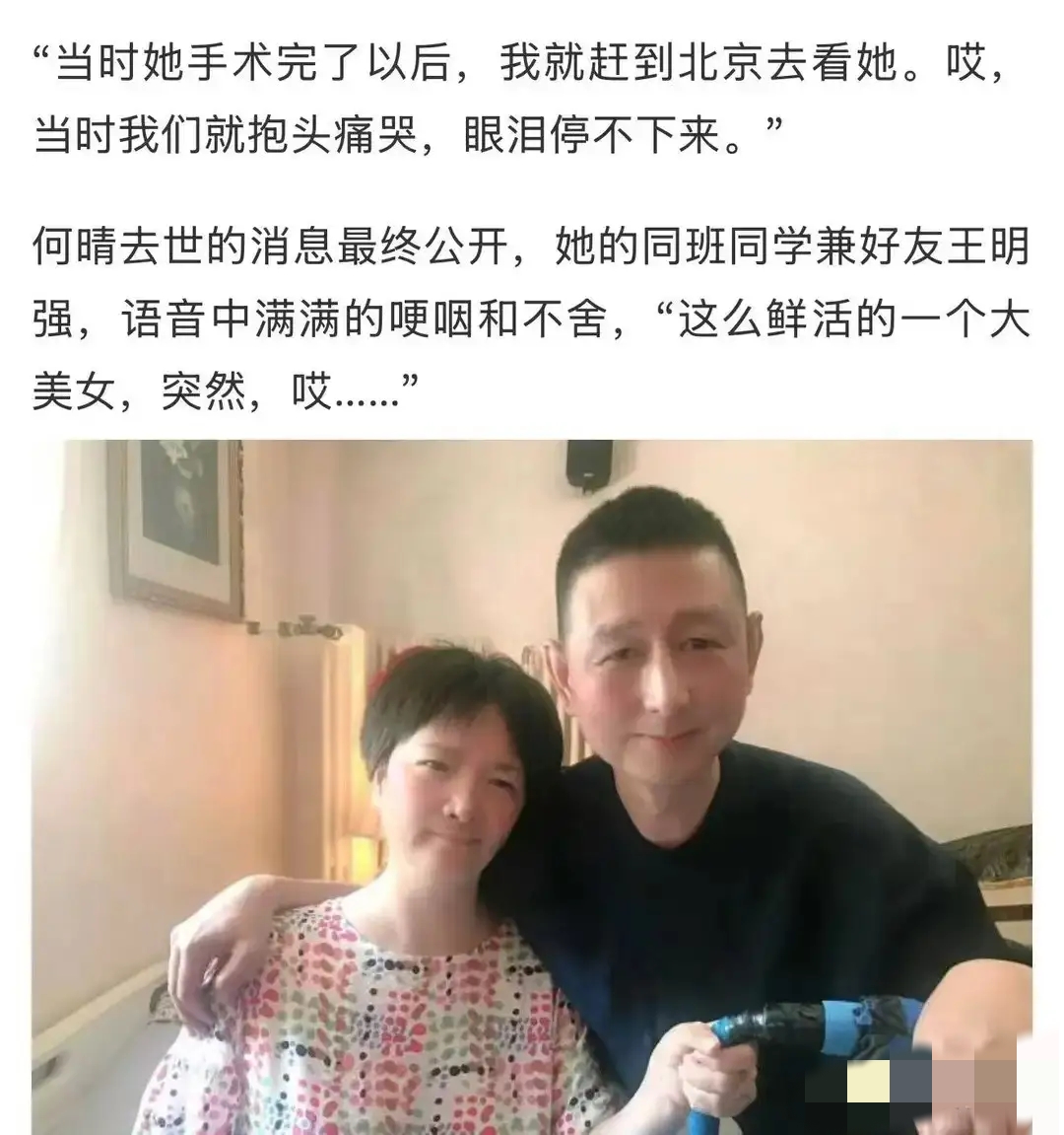 何晴的同学王明强说,何晴手术不久,他就赶到北京去看她。看到何晴虚弱的样子,他与何晴抱头痛哭。