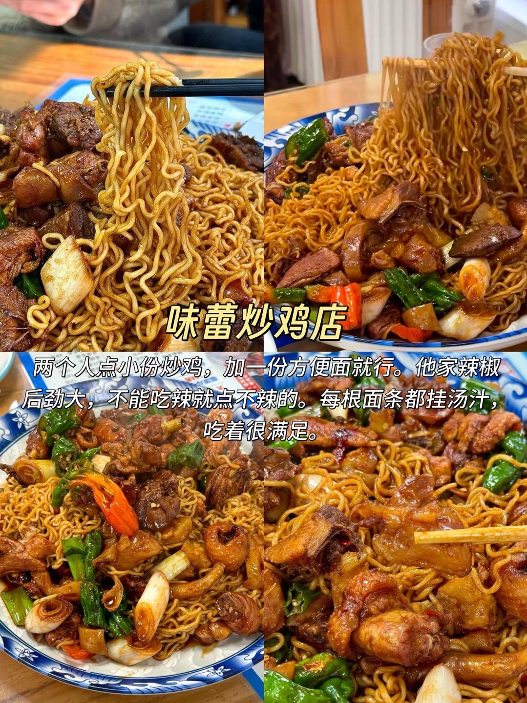 📍味蕾炒鸡店:两个人点小份炒鸡,加一份方便面就行。他家辣椒后劲大,不能吃辣就点不辣的。每根面条都挂汤汁,吃着很满足。