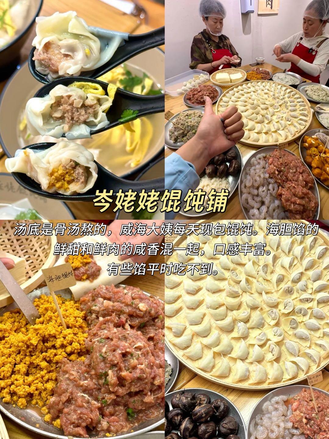 📍岑姥姥馄饨鋪:汤底是骨汤熬的,威海大姨每天现包馄饨。海胆馅的鲜甜和鲜肉的威香混一起,口感丰富。有些馅平时吃不到。