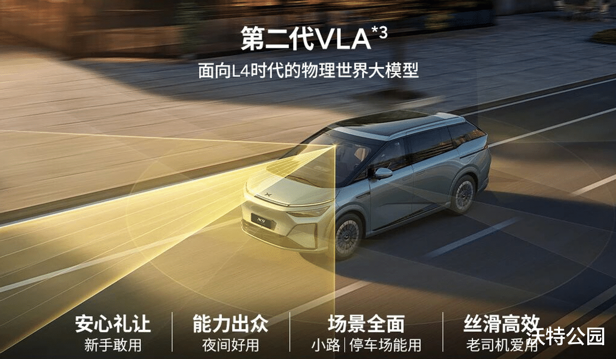 首先值得关注的是智驾系统的升级。2026款X9全系标配了图灵AI芯片,官方给出的有效算力数据是2250TOPS。单纯看算力数字可能没有太大意义,更重要的是它搭载了第二代VLA视觉语言动作模型。几个比较重要的提升体现在:可实现识别各种异形车辆、绕行事故现场、起伏烂路提前降速、夜间礼让小动物等能力;并且全场景覆盖园区小路、乡村土路及无导航道路,还支持原地起步。