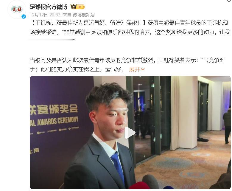 反观某些年轻球员,他们还在为中超出场努力,可是王钰栋不仅是球队绝对主力,更是球队进球王,他获得最佳青年球员,并没有炫耀,而是强调只是运气好,这种谦逊与刻意低调,才是他做人的高明之处,不像某些球员,获得一个奖项就开始在别人面前吹自己有多厉害,对于他是否留洋,他却这样说?