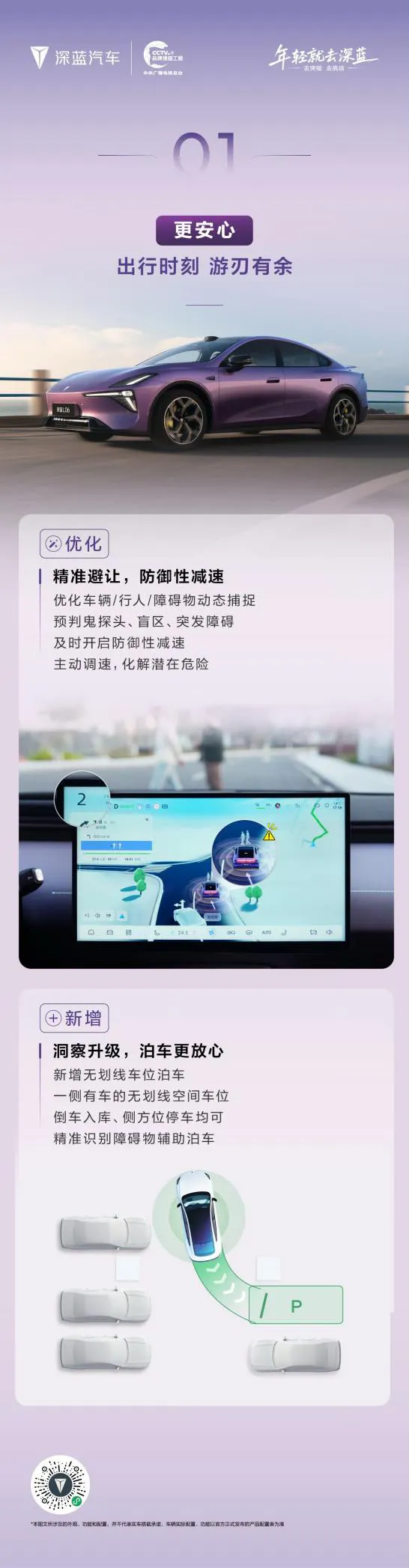 深蓝L06针对障碍物避让与泊车场景进行优化。车辆对行人、车辆等障碍物的避让更精准,可实现防御性减速,有效化解潜在危险。新增无划线车位泊车功能,在一侧有车的无划线空间,顺利完成倒车入库、侧方位停车等操作,泊车更放心。