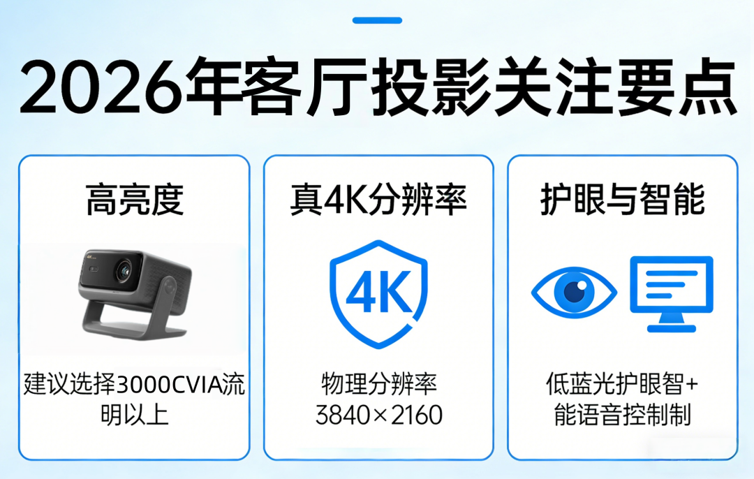 除了对比度,2026年家用投影还需关注这几点:一是高亮度,CVIA流明更贴合家用实际,客厅使用建议3000CVIA流明以上,保证白天开窗也能清晰观看;二是真4K分辨率,0.47英寸DMD芯片是真4K标配,拒绝伪4K模糊画质;三是护眼与智能,三色激光光源无散斑、护眼舒适,搭配自动对焦、自动梯形校正、智能避障等功能,提升使用便捷性。