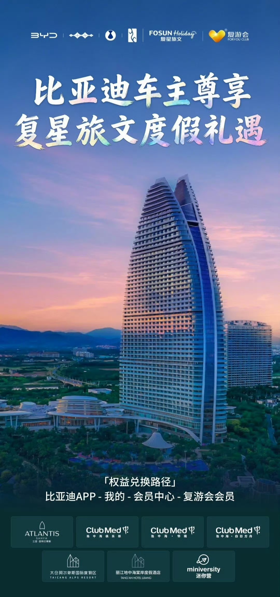 三亚·亚特兰蒂斯的海景房礼遇、Club Med地中海俱乐部的亲子度假权益、地中海·邻境与白日方舟的专属体验,还有积分兑换、优先预订、房型升级等隐藏福利,统统向比亚迪车主敞开!复星旅文全球超2000万会员资源加持,让绿色出行无缝衔接品质度假,双重美好!