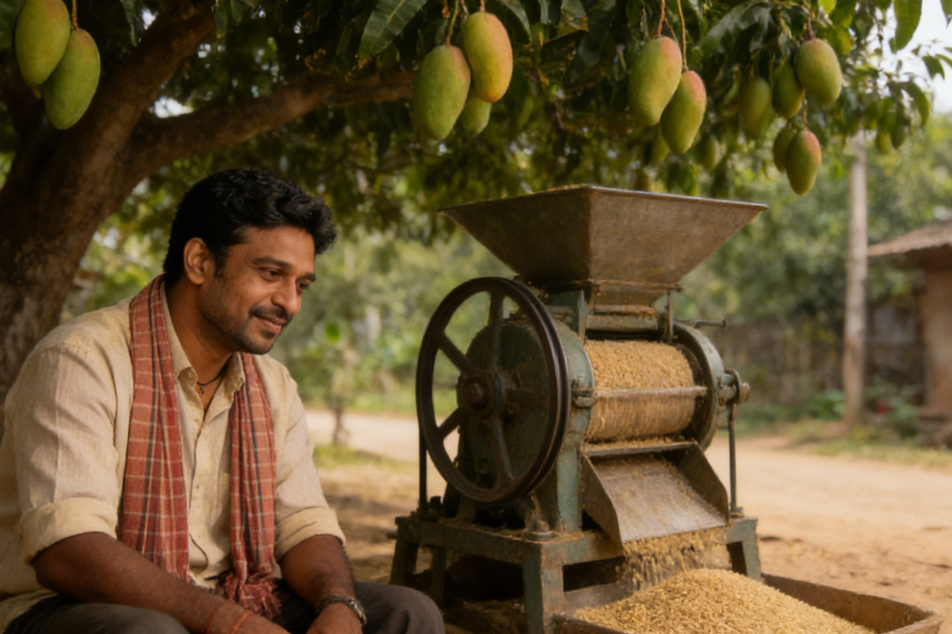 班达的碾米机就摆在村口,一棵大芒果树下面。机器是国产的,看着有些年头了,外壳晒得发白,但擦得很干净。旁边摆着几把塑料椅,几个老头坐在那儿聊天。