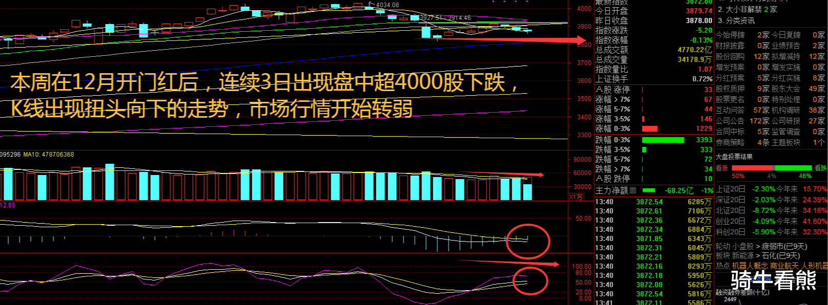 本周连续3日盘中出现超4000股下跌,这就意味着市场进入到极弱行情的回调阶段,指数跌幅并不大,但是个股出现明显的泄洪走势。最大的问题在于外盘欧美股市大涨,A股却开启了“跟跌不跟涨”的走势,这也说明场内资金还是撤退为主,这也导致了做盘难度进一步提升。这里与其去考虑何时A股能够进一步上涨,不如开始考虑风向向下了,该如何进行有效地防守反击策略。