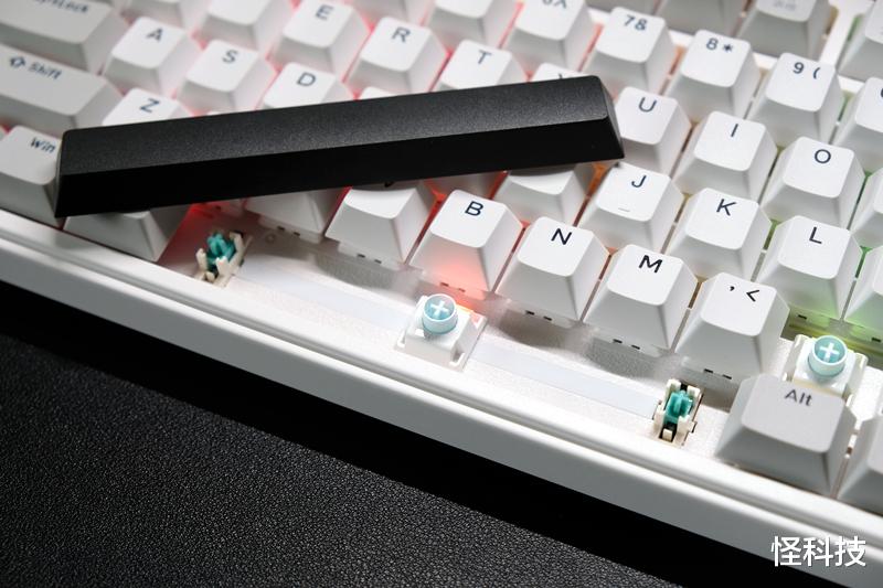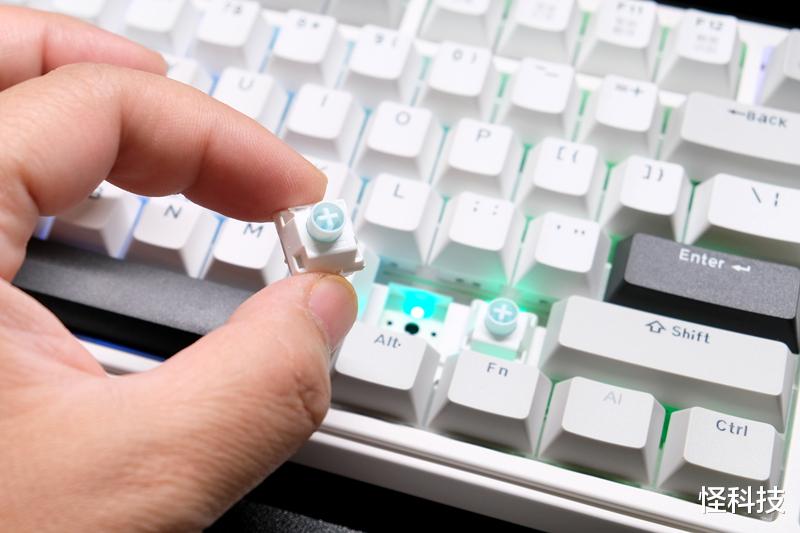 R87Pro AI基础版的键帽使用PBT工艺,印刷清晰不易打油;自家定制的冰川轴支持热插拔,看上去非常清爽,敲击手感类似红轴没有段落感回馈,触发行程适中,长时间码字和比较激烈的FPS类游戏都很适合;键盘内部采用Gasket结构、4层填充,定位精准,包括大键在内的各个区域都有很好的一致性,整体搭配起来给人一种扎实的感觉。