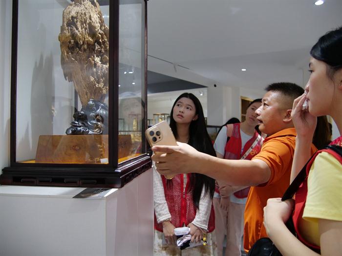 在定慧沉香公司展厅,天然沉香木山子摆件《大彻大悟》吸引了队员目光——工匠依自然形态稍加雕琢,成就“虽由人作,宛自天开”的艺术境界。香艺师黄碧贞讲解道:“上等沉香木需数十年孕育,大型木雕常耗工匠数年心血。”随着年轻消费群体崛起,传统木雕已融入茶器、文玩等新元素,在保留古韵的同时展现当代雅趣。