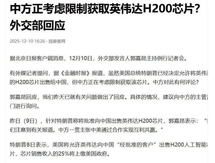 特朗普官宣两天后,中方就明确了H200进口的“逐单审批”(即双重备案)机制,两道硬关卡直接堵死了美方的操控空间。