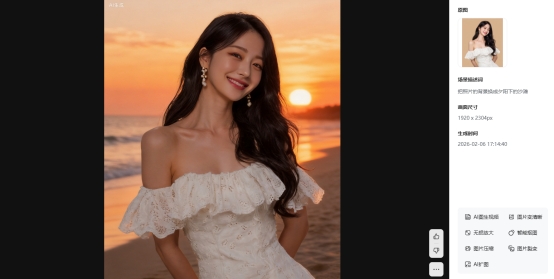 第二步,在左侧输入指令描述,你只需要用一句话说明想修改的内容,比如“把背景换成海边”“把衣服颜色改成黑色”“提升图片清晰度”等。