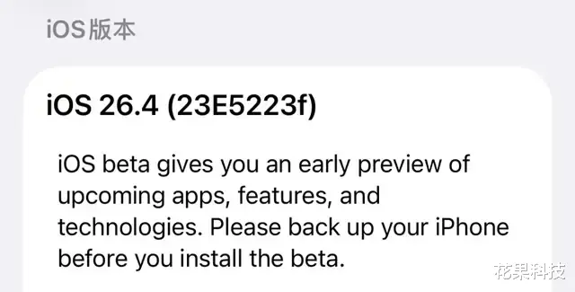 iOS 26.4 Beta 3 的版本号是 23E5223f,这个版本没有带来明显可见的新功能,但也有一些改进。