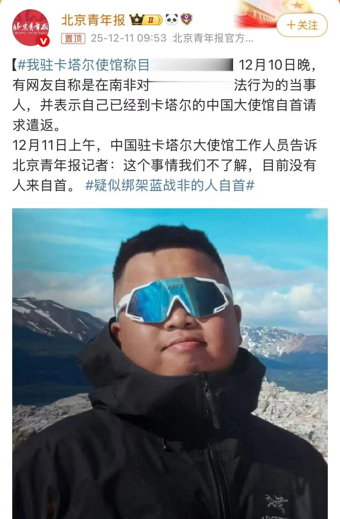 到现在为止蓝战非并没就此发表任何言论,我国驻卡塔尔大使馆的工作人员告诉北京青年报记者,对于这个事不了解,也没人来自首。