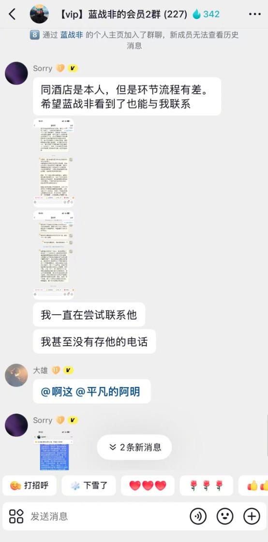 此外,这个人还发了一些他联系蓝战非的留言,并贴了一些照片,全程都在表达一个信息,事件不是蓝战非说的那样。