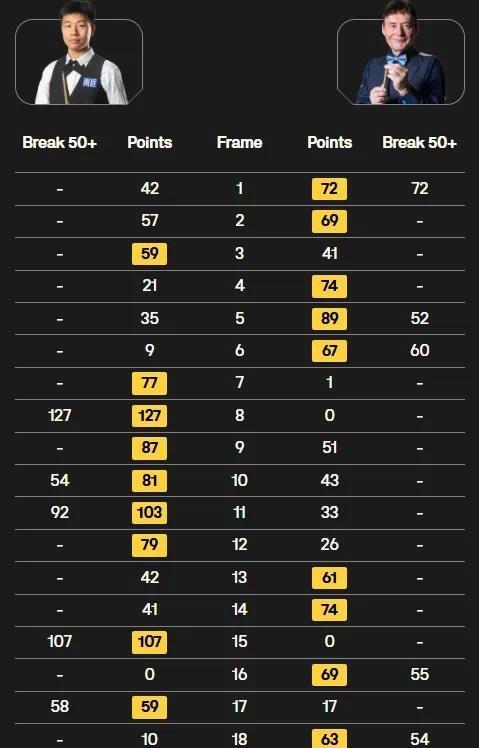 斯诺克赛场从来不缺乏奇迹,但经验的沉淀同样是无形的财富。全场比赛的技术统计完美印证了这是一场高水平的高能对轰。高阳在进攻端展现出了极其火爆的手感,狂轰两杆破百(127分、107分)以及三杆50+(54分、92分、58分),单杆杀伤力十足。而63岁的怀特则用行动证明了“白旋风”的底蕴犹存,他在长局制中凭借深厚的走位细腻度,同样回敬了五杆50+(72分、52分、60分、55分、54分)。两位球员联手奉献了十杆高分,让这场资格赛打出了正赛的质感。